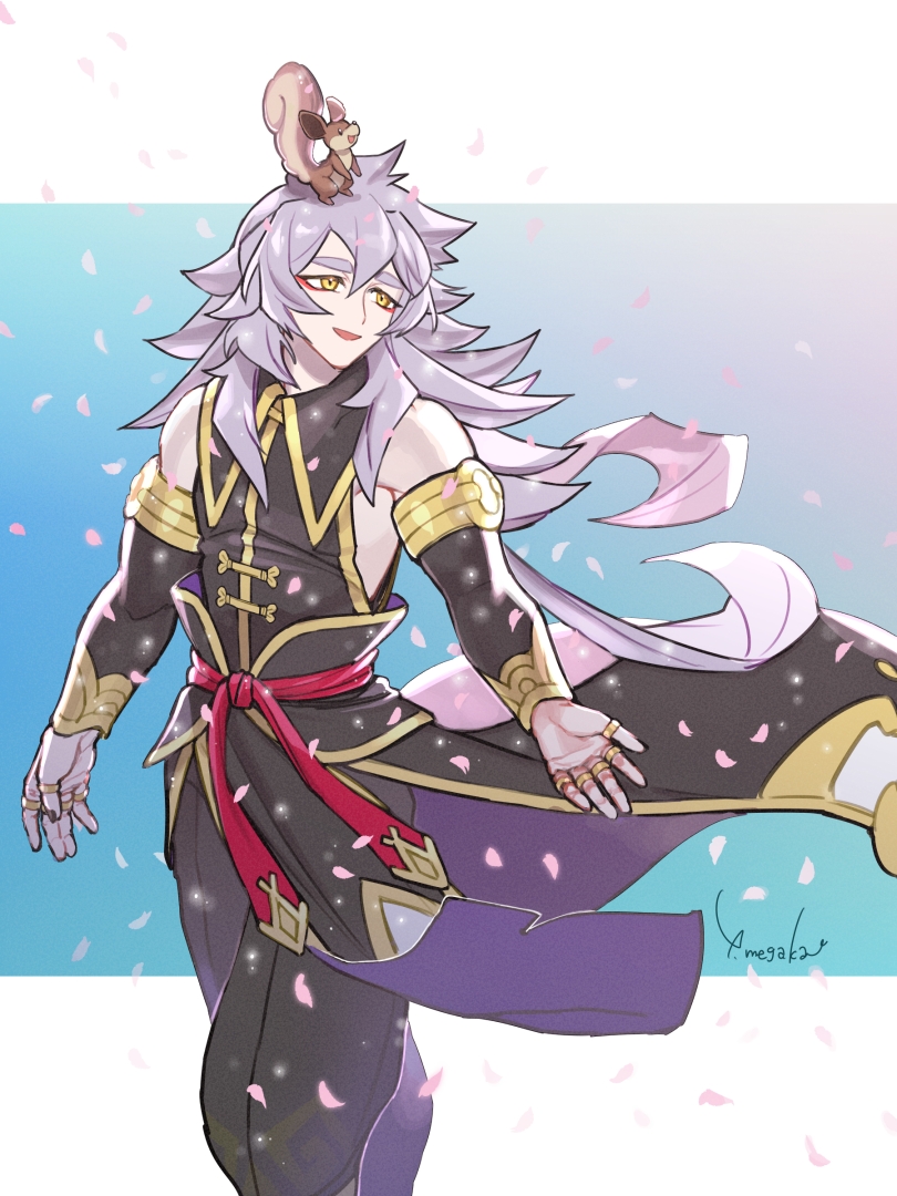 春をテーマに、桜の花弁が舞い散るところにいるビコウオウとリスを描きました。